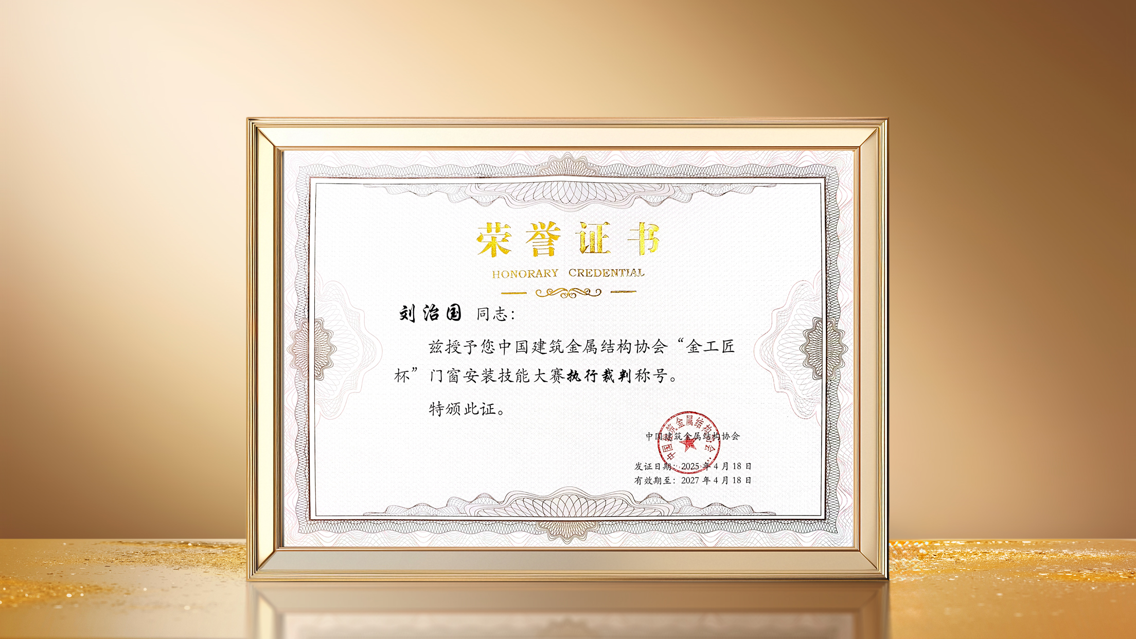 此外,刘治国先生被授予中国建筑金属结构协会“金工匠杯”门窗安装技能大赛执行裁判称号。这一荣誉不仅是对其专业成就的高度认可,更彰显了好博好博窗控长期以来在推动行业标准化建设中的卓越贡献。